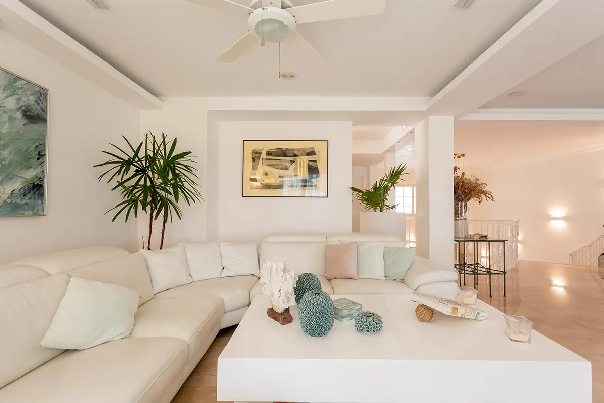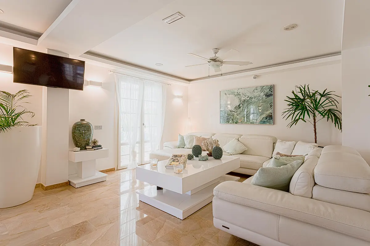 The Living Room is a haven of luminous calm where you can feel the Caribbean even before you look out at the sea. Decorated in shades of ivory and sand, the room features spacious chaise longue sofas upholstered in light-coloured leather, designed for conversation, reading or simply relaxing after a day at the beach.